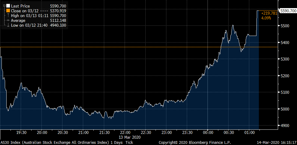 The week ending Friday 13th March 2020 will go down in history as one of the most volatile weeks in sharemarket history. The Australian sharemarket (as defined by the S&P/ASX All Ordinaries index) finished down more than 11% and global sharemarkets (as defined by MSCI World index) finished down more than 12%. Even Friday the 13th saw incredible volatility in the Australian sharemarket (See Chart 1) started the day down almost 8% before a 12% turnaround to end the day up 4.4%.