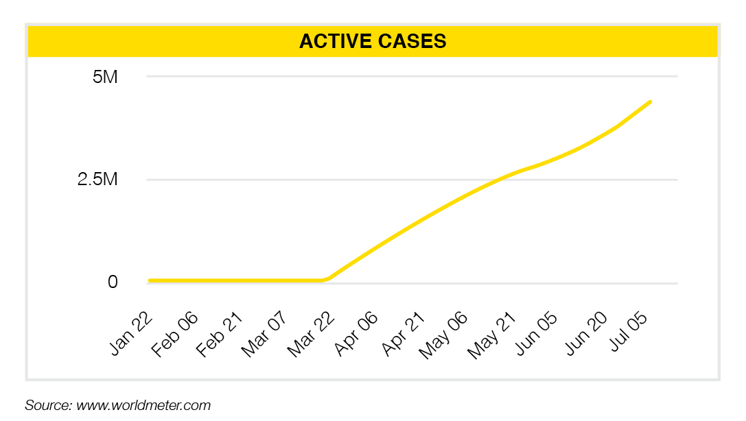 - A second acceleration of global cases has threatened many economies around the world who opened their economies and relaxed restrictions. Most notable accelerations are in the large population countries that include USA (~3million cases), and major emerging economies Brazil (~1.7million cases), India (~0.7m cases) and Peru (~0.3m cases).