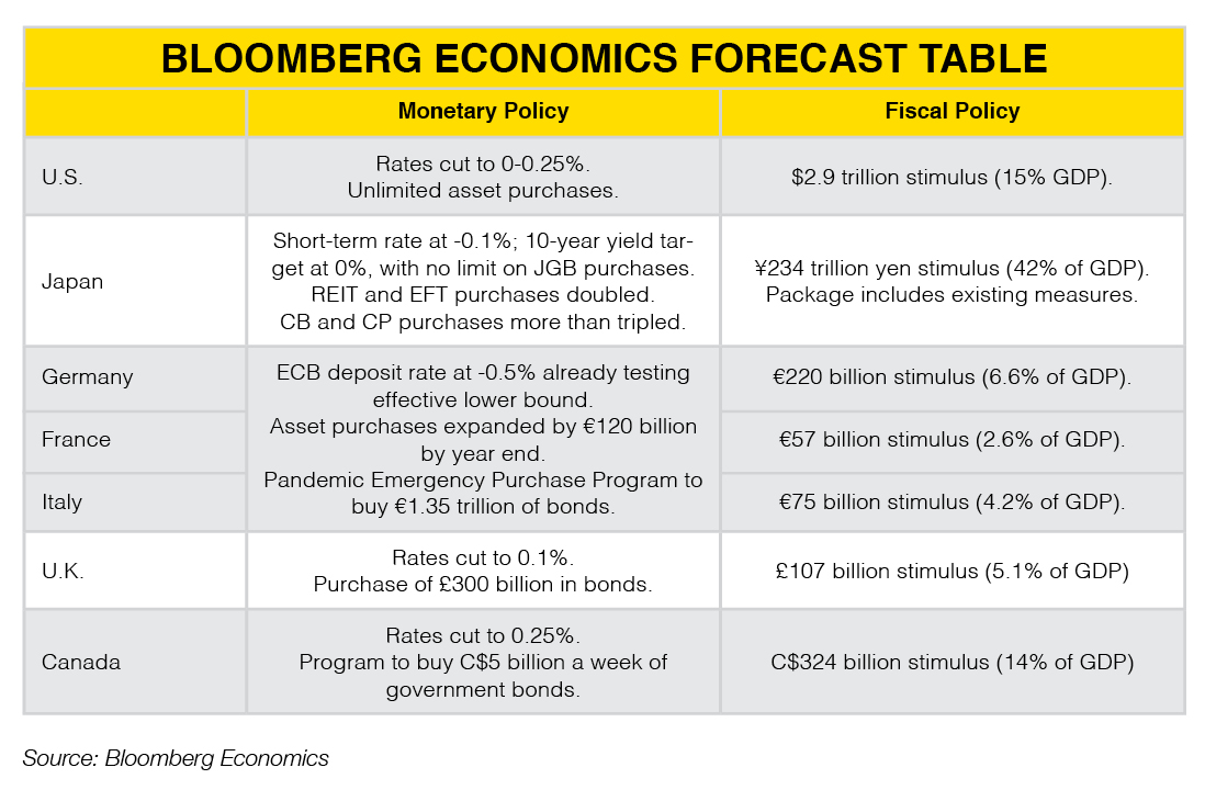 - The current recession is accompanied by government enforced high unemployment that most economists believe will remain elevated for years to come… this may keep inflation down, despite the enormous global fiscal and monetary stimulus provided from all major economies (see second below).