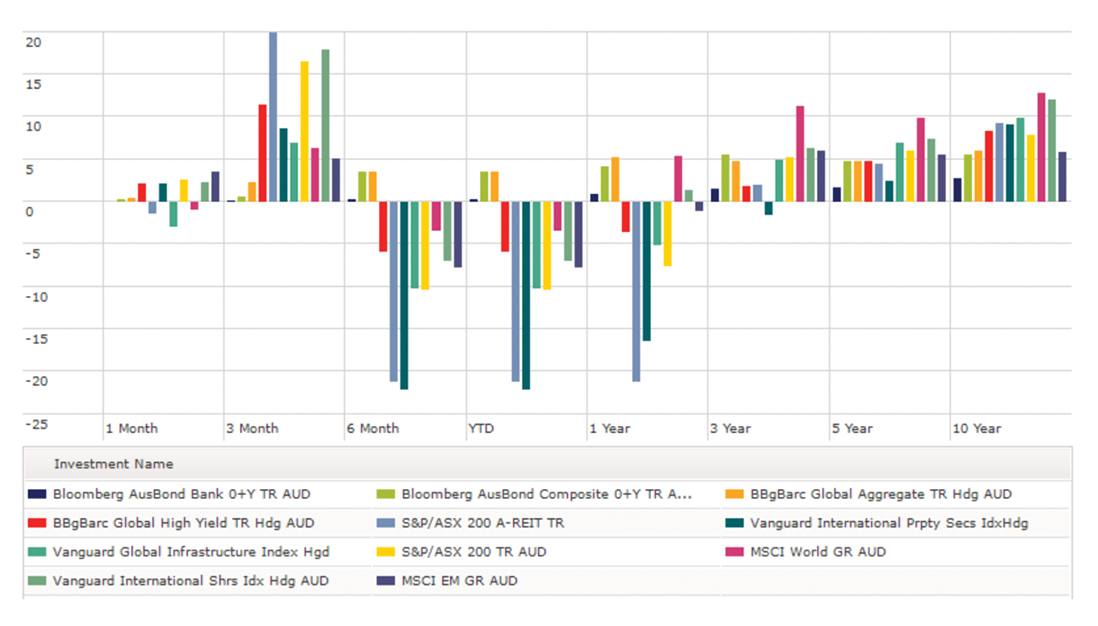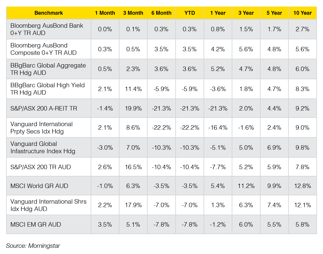 - After a poor first quarter, equities have bounced back strongly and the 2nd quarter say greater than 15% returns from Australian equities (16.5%), Australian REITs (19.9%), and Hedged Global Equities (17.9%).