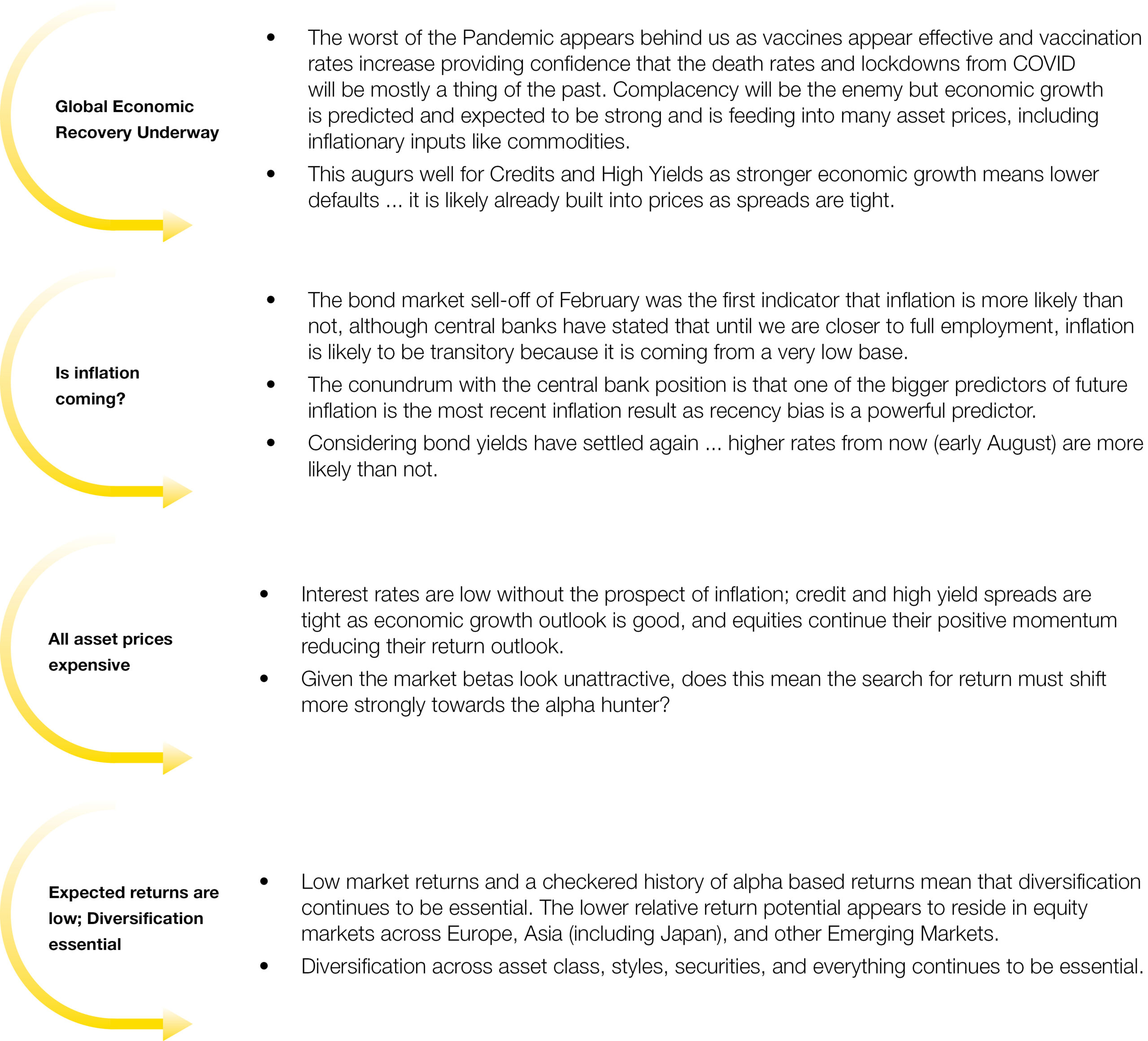 - The performance in the 3 months to end of July was generally good for global risky assets (Global Equities up more than 10% in AUD) as the vaccination roll-out gave momentum towards a positive outlook around the world.