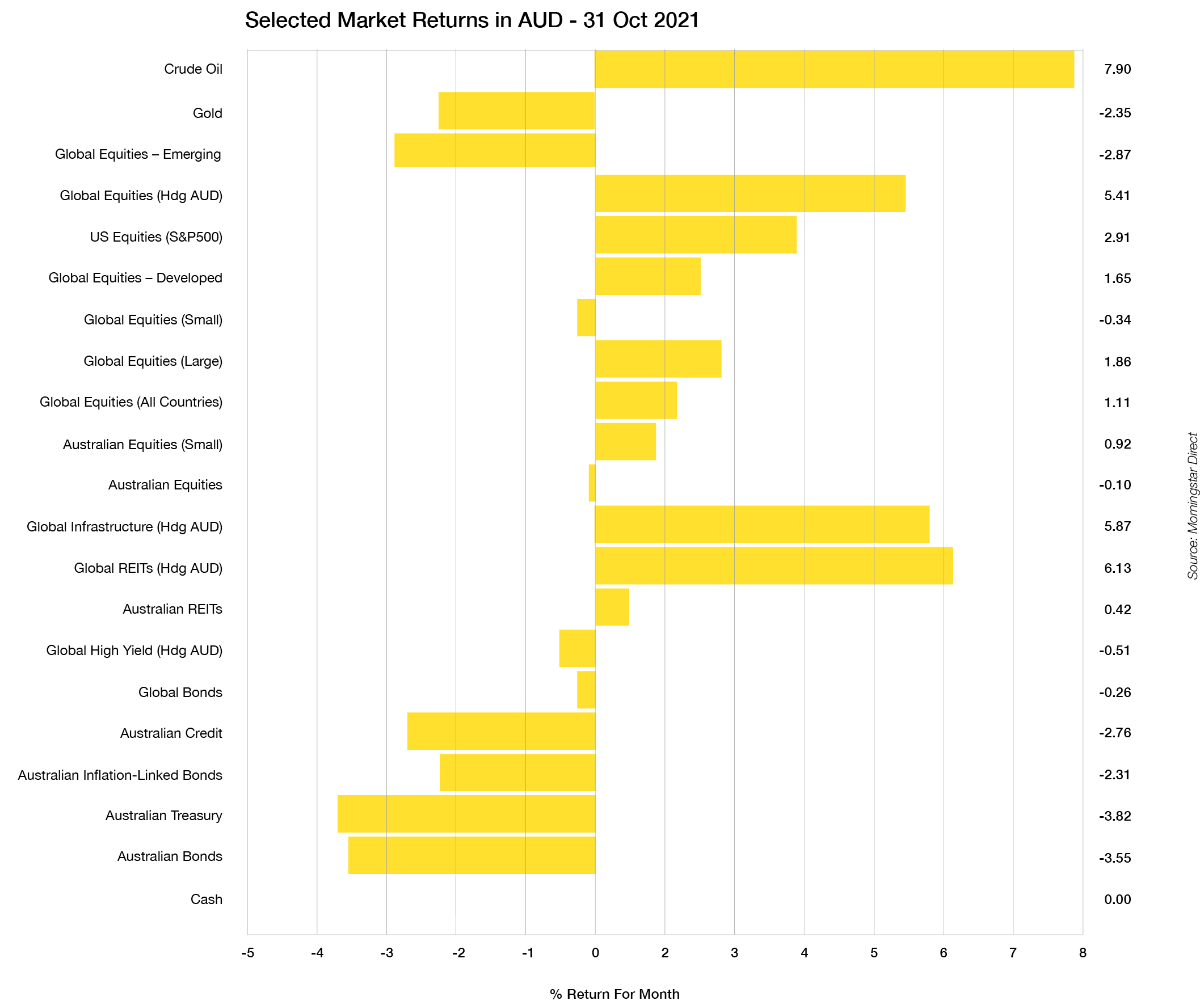 - A stronger Australian dollar also meant unhedged global asset returns were slightly reduced. This strong dollar was driven by the higher Australian bond yields and in spite of the 11% drop in Iron Ore prices (which are down around 60% from its highs earlier in the year).