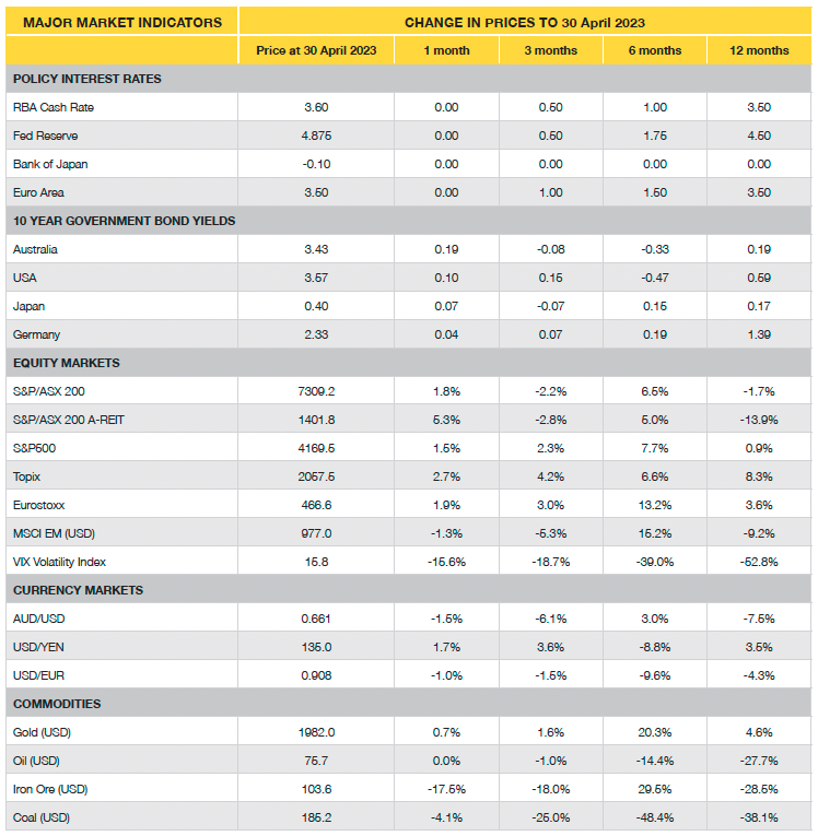 - The 2023 exuberance for all risky assets continued in April as cash rates largely stayed on hold in Australia and amongst the major economies. Although we now know that changed over the first week of May as the Australian Reserve Bank, European Central Bank, and Federal Reserve all increased by 25bps as the battle to tame inflation continues.