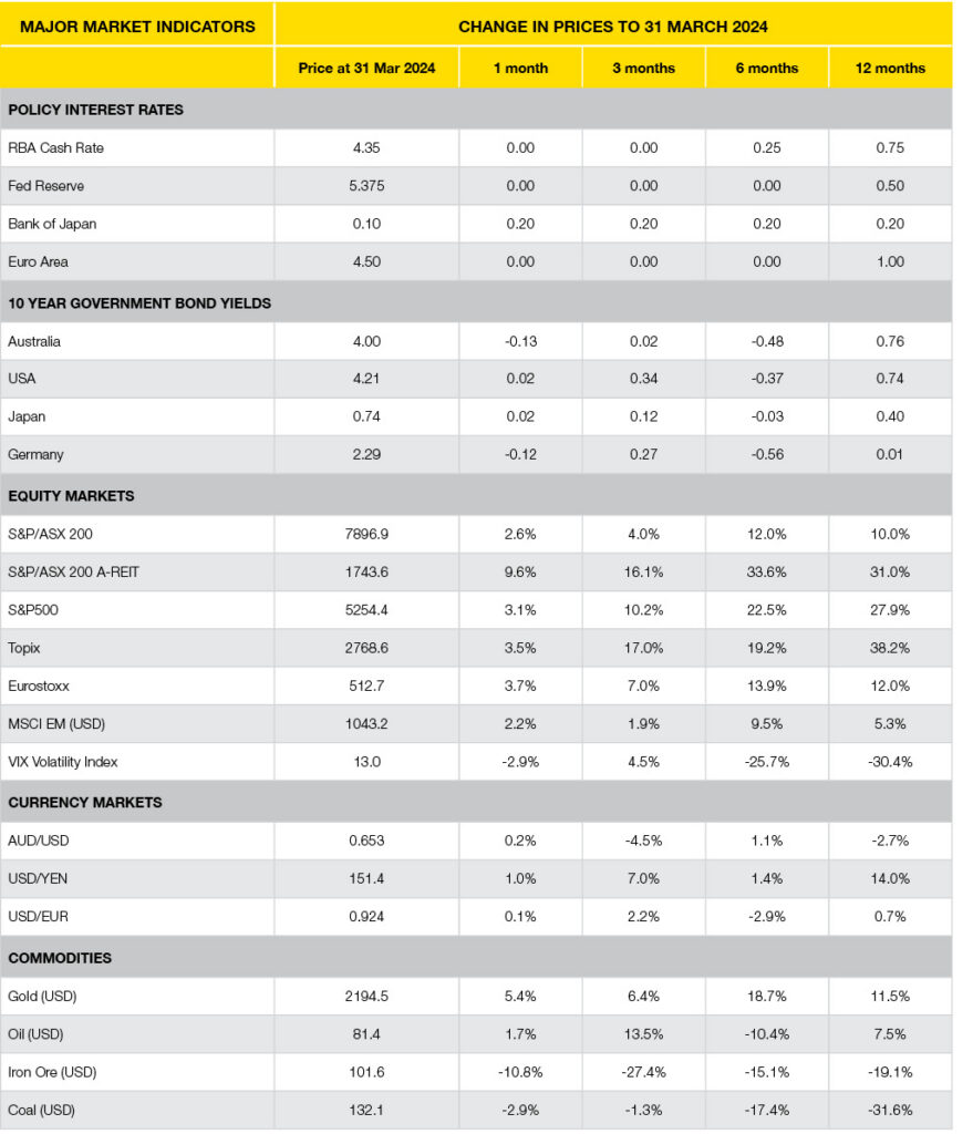 - The weaker economy in 2024 (to 2023) appears to be playing out as expected. The Magnificent 7 (Apple, Microsoft, Amazon, Google, Facebook, NVIDIA, and Tesla) momentum appears to be slowing and breaking up (as per the movie). Whether this is any type of regime change is too early to tell, and markets are only back to their position at the start of March.