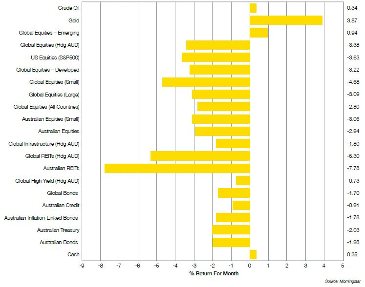 - Almost all asset classes declined in value over April, with the shining star amongst sharemarkets being Emerging Markets, which were up a little under 1%.