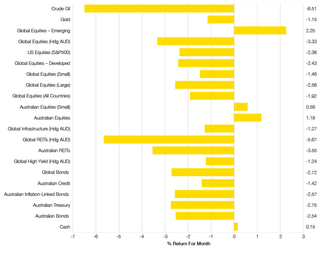 - As Chart 1 shows, the only equity markets that have not declined during August were Australian Equities and Emerging Markets. These equity markets are generally regarded as “Value” or cheaper markets, which have been less prone to concerns about higher interest rates.