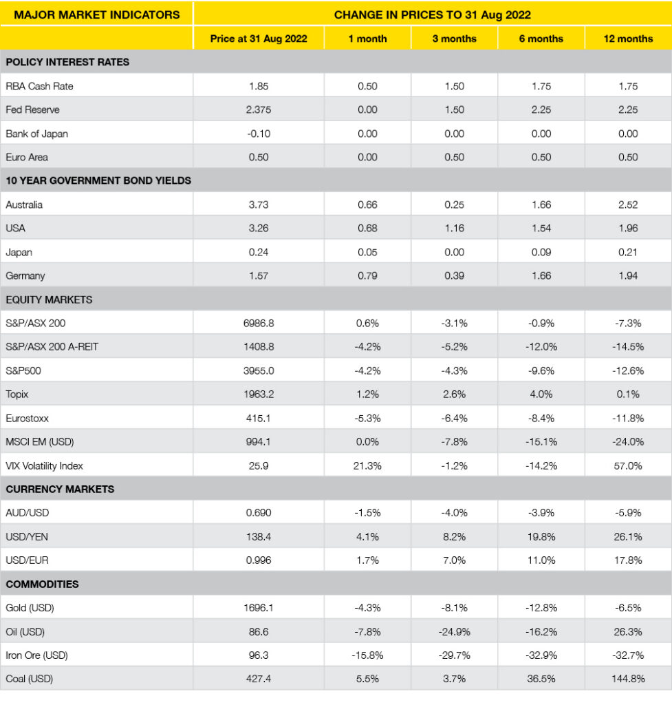 - Most equity markets around the world were having a positive August, and then on 26 August, Federal Reserve Bank Chair, Jerome Powell, made a short speech at Jackson Hole’s economic symposium saying, “our responsibility to deliver price stability is unconditional” and “we must keep at it (i.e. increasing cash rates) until the job is done (i.e. lower inflation)”. Equity markets accepted these statements (amongst others) as higher cash rates at any short-term economic cost … equity markets have been falling since then.
