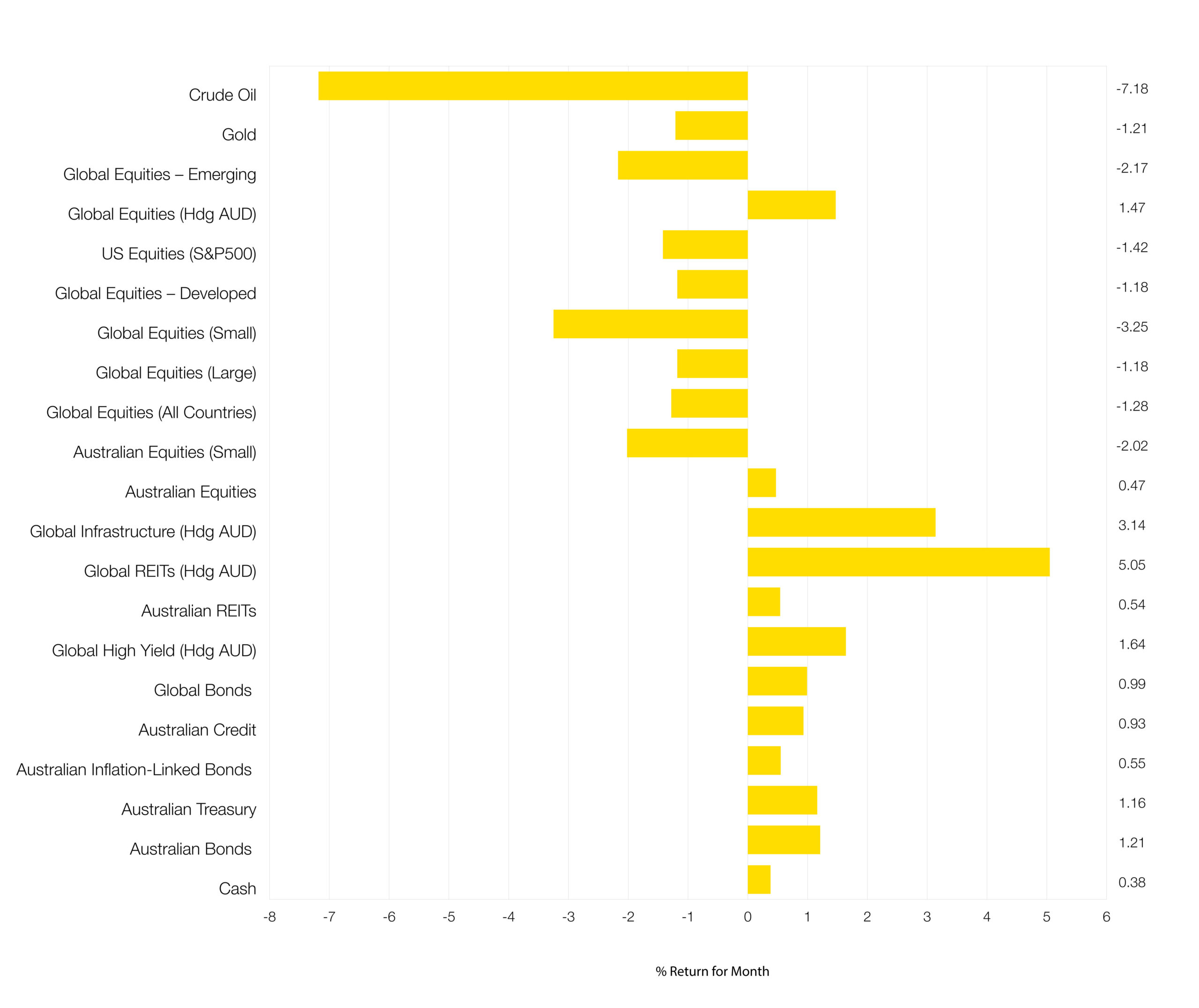 - As Chart 1 shows, the best performing assets over August were the long duration Global REITs (up 5%), Global Infrastructure (up 3.1%), and Australian and Global Bonds (up 1%).
