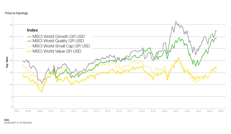 MSCI World Growth and Quality trade around 30 times whilst Value and Small Cap have valuations almost half that.