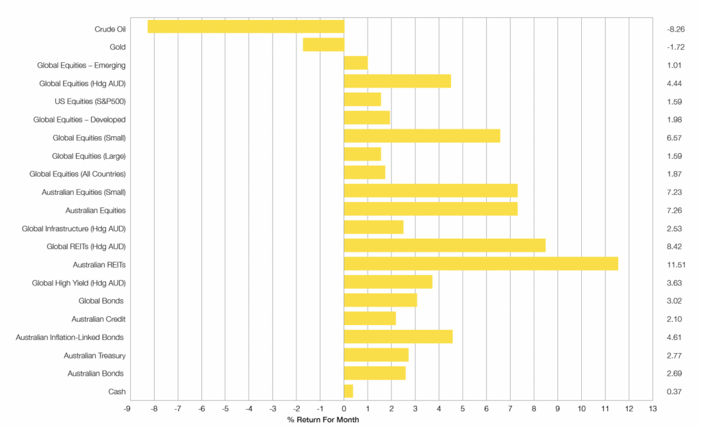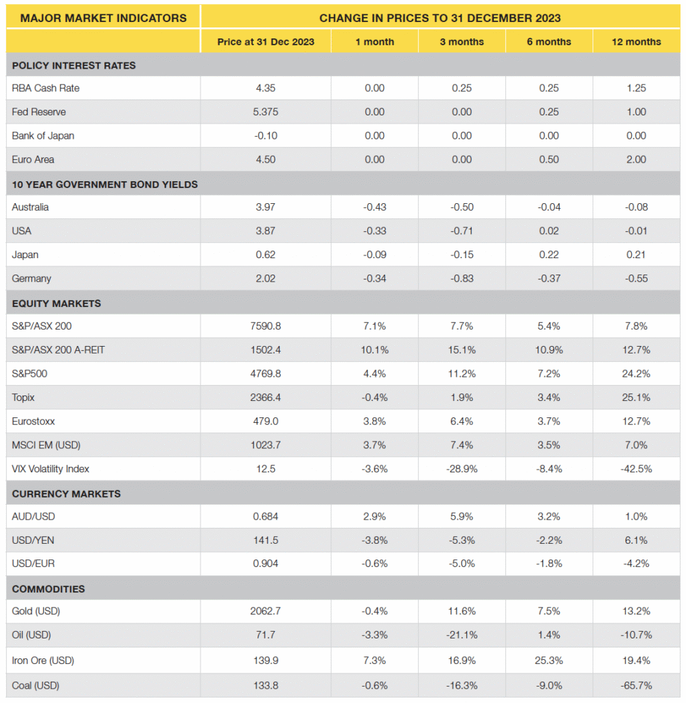- Another very strong month for equity markets and other risky assets as the prospects for lower cash rates in 2024 due to low inflation gained momentum.