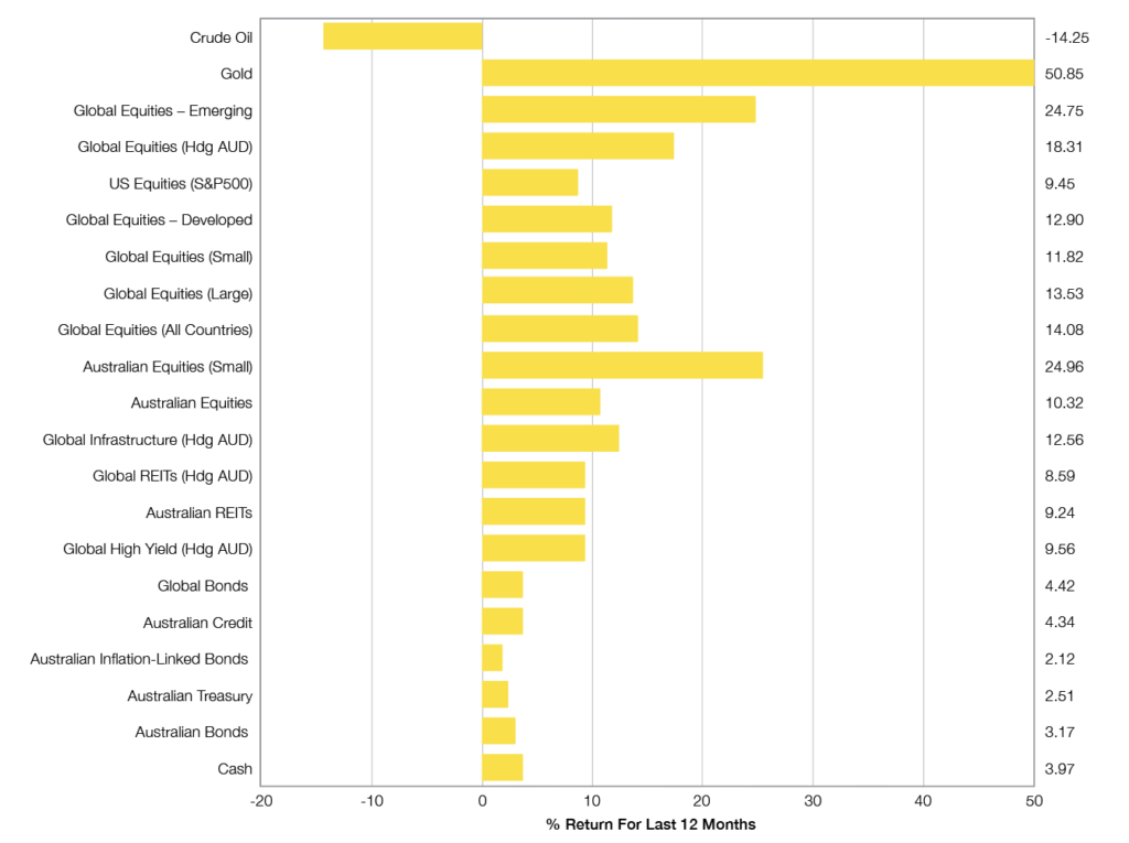 Selected market returns in AUD – 12 months to 31 Dec 2025