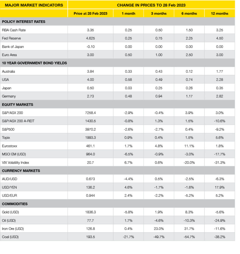 - It’s still largely about the USA and the belief that inflation is persisting longer than previously indicated. This means cash rates are going higher and the Federal Reserve Bank’s determination to slow the US economy is getting stronger. This meant bond yields increased again (therefore prices went down) and some fear returned to sharemarkets and recently declined.