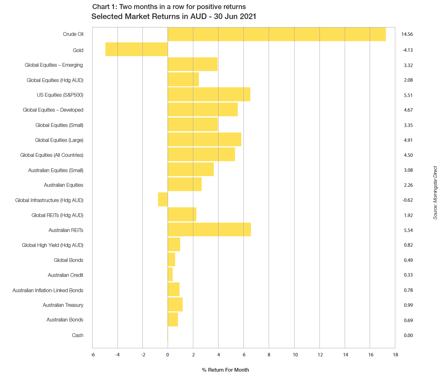 - With the exception of Gold (down ~4%), almost all risky asset classes showed strong returns during June. This was largely driven by continued fiscal and monetary stimulus as well as increased confidence as successful vaccination showed significantly lower case and death rates.