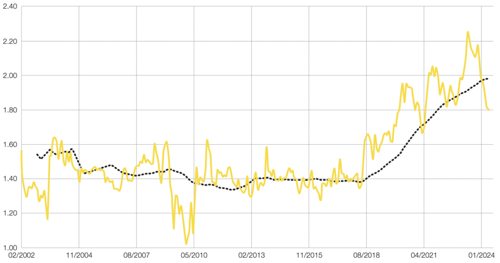 2M.40SCI World Growth/MSCI World Value PE Ratio