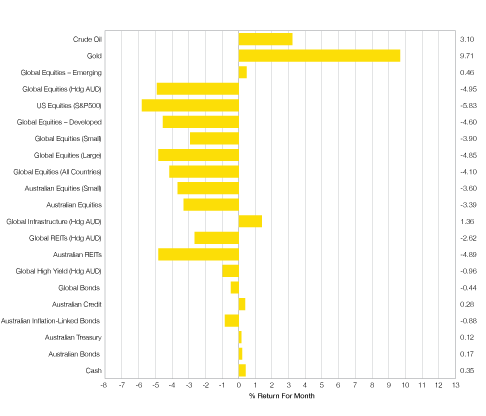 - Conservative, boring, cash and bonds were best performing asset classes and the previously struggling Global Infrastructure asset class, often seen as a defensive sharemarket position, also produced positive returns in March.
