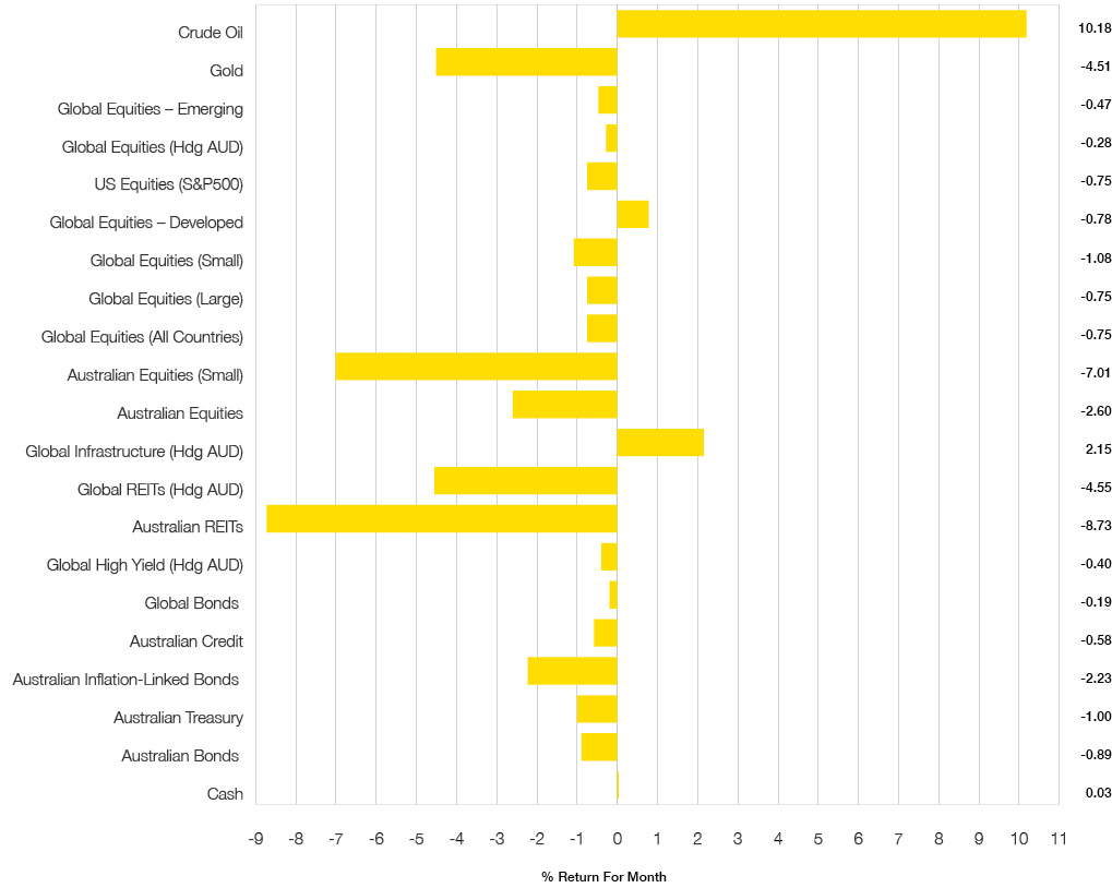 - Except for energy commodities (Oil and Coal), most equity and bond markets declined again in May. The worst performance came from REITs, where Australian REITs declined by almost 9% and Global REITs by almost 5%. Contrasting REITs was the positive return of the other listed “real” asset, Global Infrastructure, at just over 2% for the month.