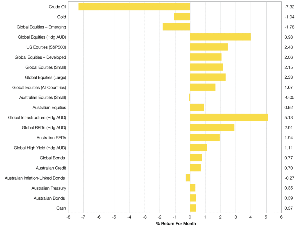- The Australian sharemarket produced almost 1% return whilst Emerging Markets were down almost 2% in Australian dollars.