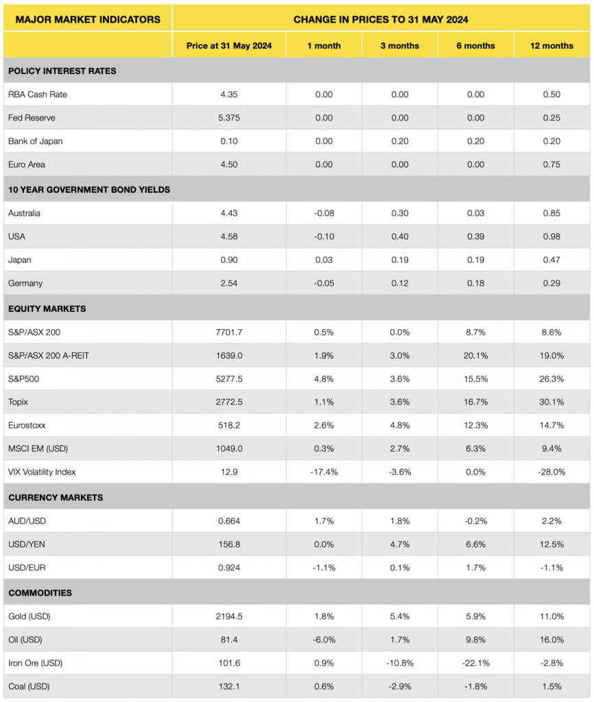 - After a brief pause by sharemarkets in April the month of May was different as sharemarkets resumed their positive momentum from previous months and the artificial intelligence juggernaut, i.e. of NVIDIA, increased more than 25%, helping the US sharemarket (S&P500) to a near 5% US Dollar return in May.
