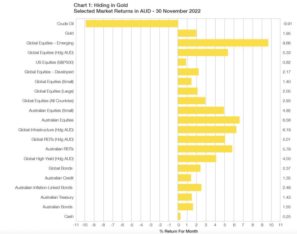 - Despite continued economic concerns about China’s zero-COVID policy, Emerging Markets (MSCI EM) was the strongest performing asset class returning almost 10% for November, whilst Developed Markets (MSCI World) produced 2.2% and was largely lower due to a strong Australian dollar which strengthened against the US Dollar by 4.3%.