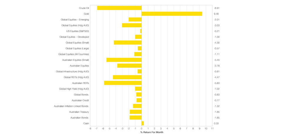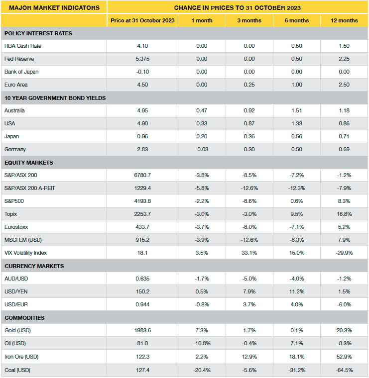 - Another difficult month for all asset classes where the only places to hide or gain a positive return was Cash and some Commodities, such as Gold and Iron Ore. Despite the commencement of the Middle East conflict, strangely, Oil declined during October.