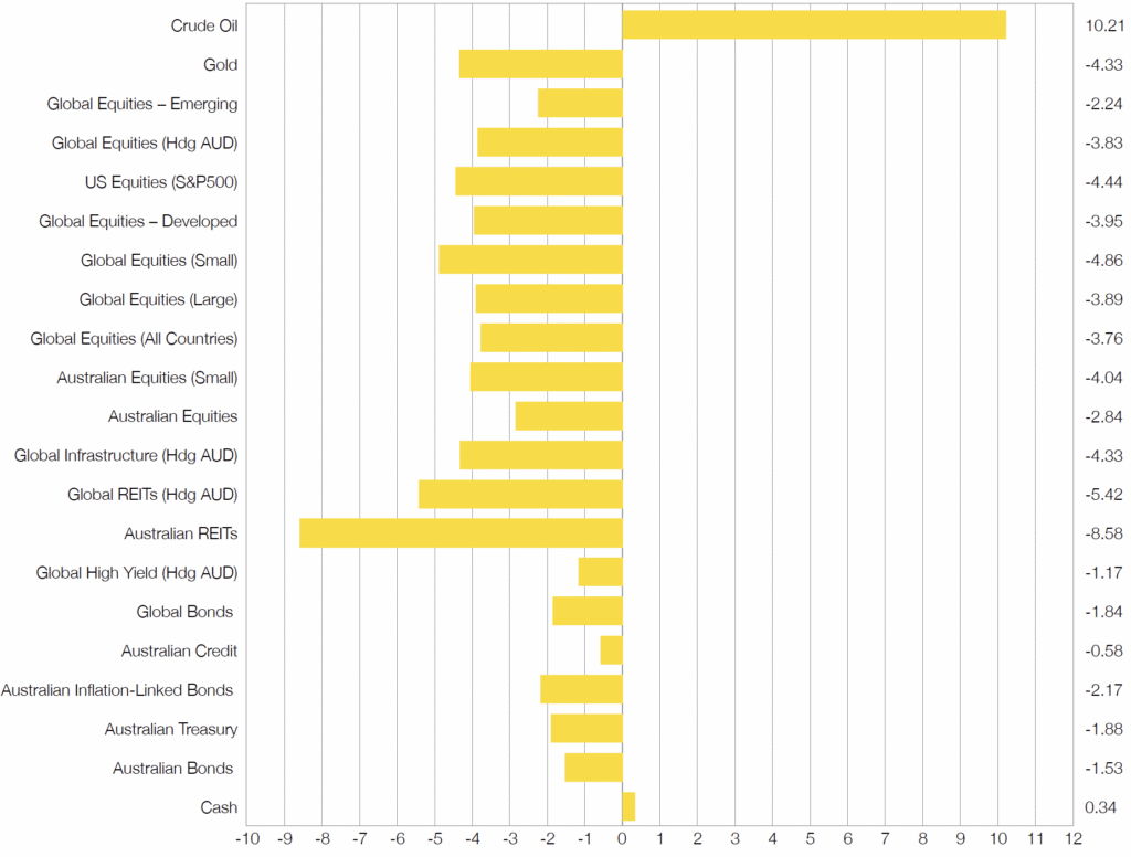 - Of course, rising bond yields means lower bond prices and often lower valuations and Australian, Developed markets, and Emerging markets also declined significaintly (down 2.8%, 4.0%, and 2.2% respectively).