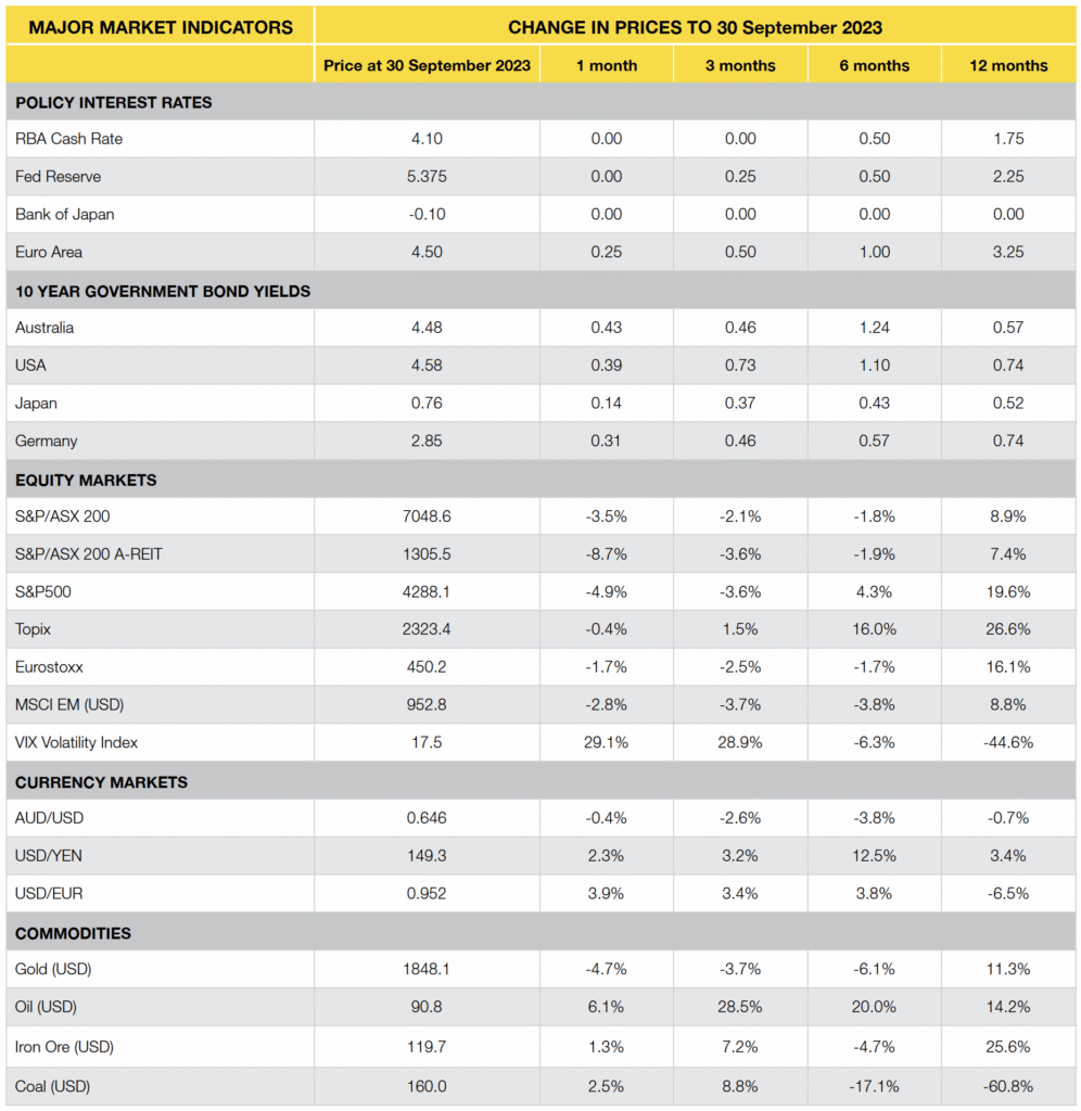 - Higher for longer appears to be the mantra of central banks resulting in higher long term bond yields (so decline in bond prices), declining sharemarkets, and punished real asset prices (generally due to their higher debt levels).
