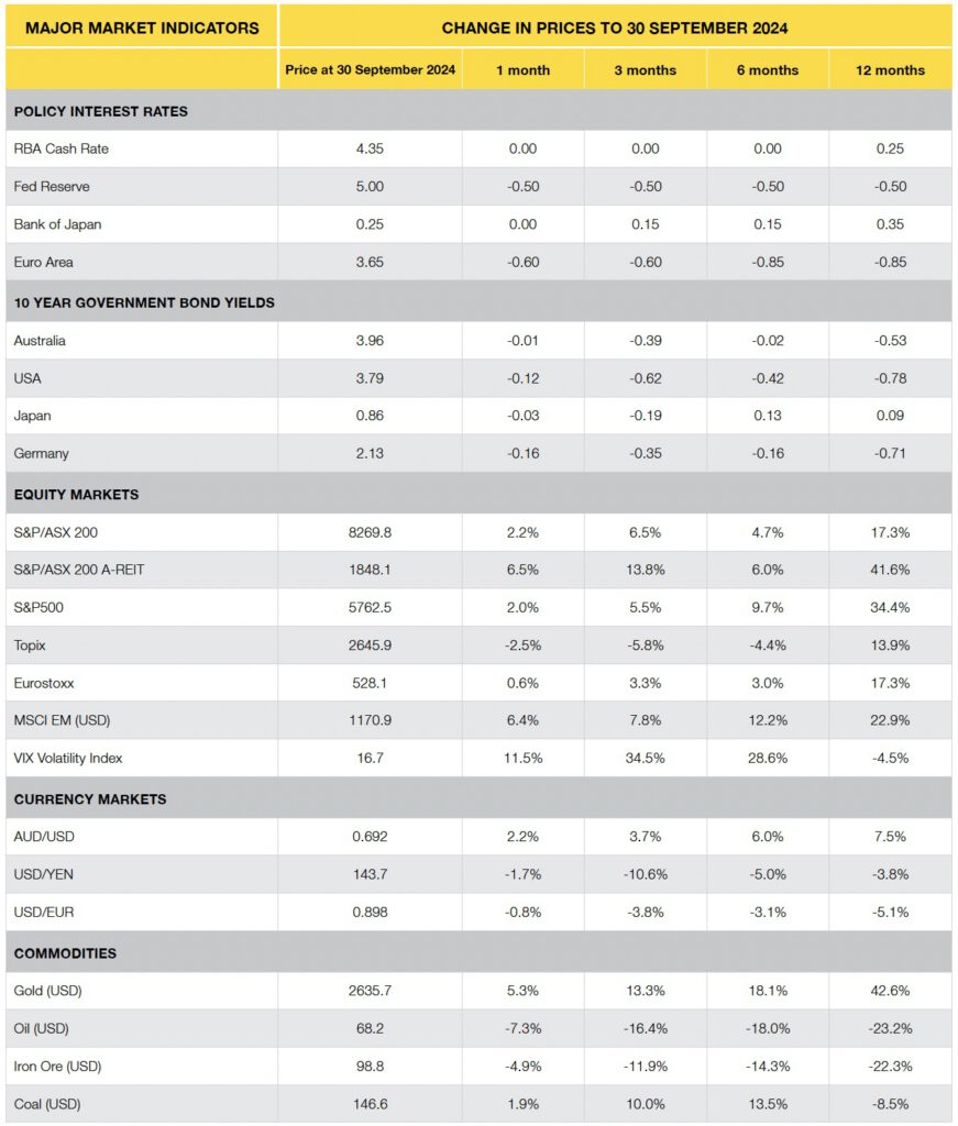 - The big news for September was the US Federal Reserve reduction in its cash rate by 50bps to 4.75-5.00%. This appeared to provide support for global bonds, property and infrastructure assets, although global shares ended the month relatively flat.