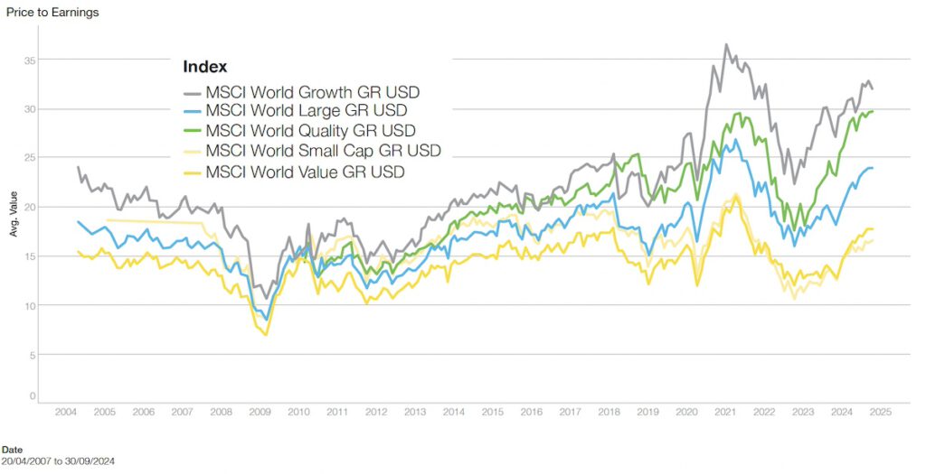 MSCI World Growth and Quality trade around 30 times whilst Value and Small Cap have valuations almost half that.