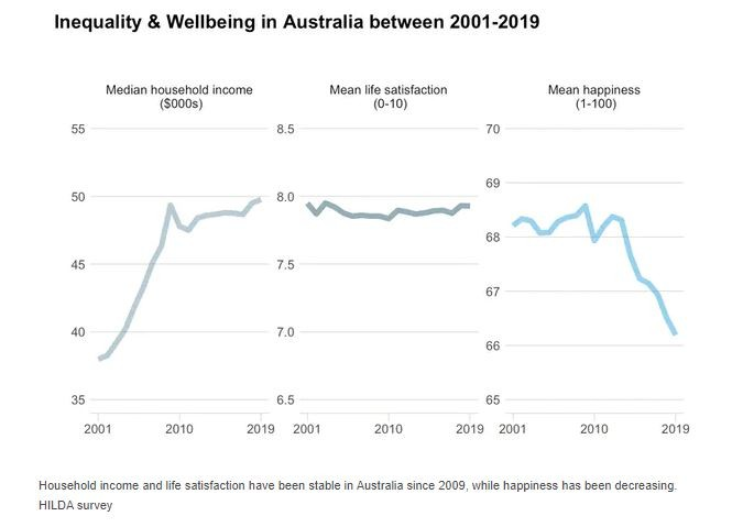 Meanwhile, typical incomes haven’t kept up. The median personal income in Australia has hovered around A$50,000 for much of the past decade. This means a growing majority of people earn well below that $74k happiness threshold. Researchers estimate the share of Australians below the “happiness plateau” rose from around 60% in the early 2000s to nearly three-quarters by 2019. Put simply, happiness has become more expensive, and many people are being left behind.