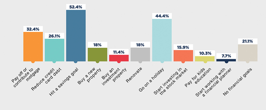 When it comes to goals for the next 12 months, the FPA survey found people were split between hitting a savings goal (52 per cent) and going on holiday (44 per cent) as their top priority. Paying off the mortgage and reducing credit card debt were also popular.