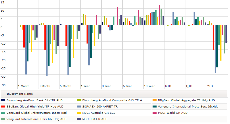 - Understandably the strongest performance wasn’t too strong with positive returns over the past 3 months coming from Cash (0.3%), Australian Bonds (1.3%), and Global Bonds (1.1%)