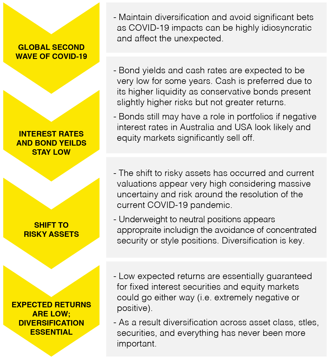 - Global factors are also likely to strong impact Australia including COVID-19 second and third waves, US election, and China relations will all continue to be significant risks regarding both the Australian economic recovery and forward risk and returns of financial markets.