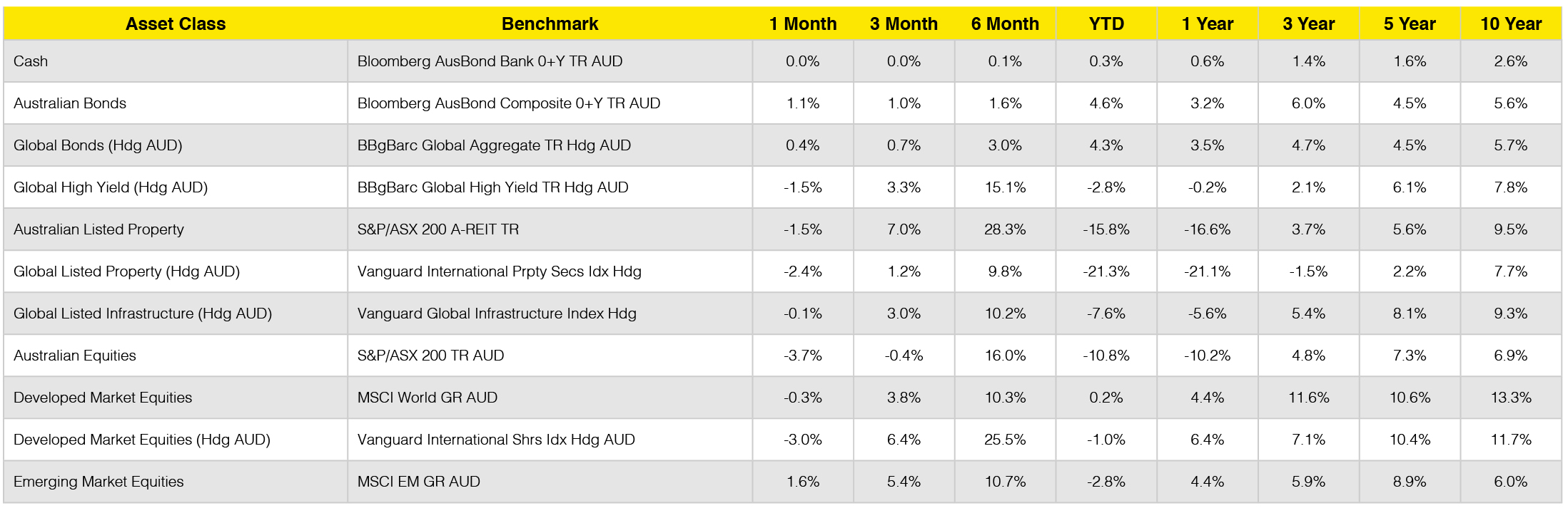- With the Reserve Bank announcing potentially more economic stimulus, the yield curve dropped a little resulting in a strong 1.1% (yes, strong!) performance for Australian Bonds to be the best performer.