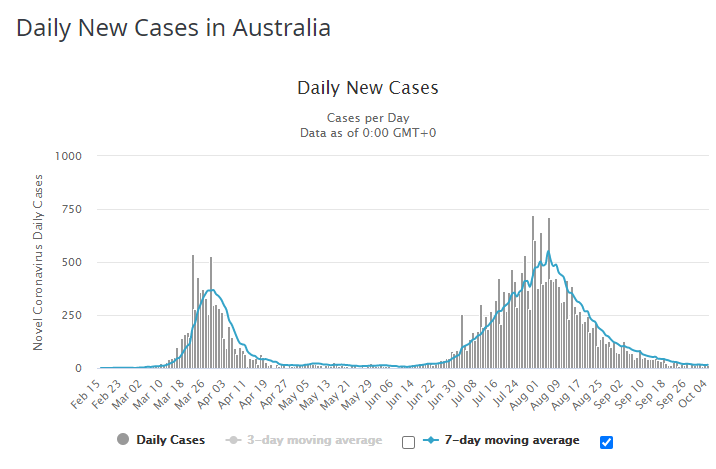 - Australia appears on top of its second wave of COVID-19 as Victoria’s hard lockdowns have flattened the curve. NSW and Queensland’s case concerns over the last couple of months have not increased substantially and both states are currently yielding very low numbers of positive cases.