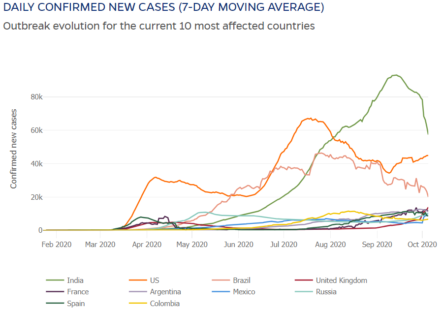 - Whilst India and Brazil are experiencing declining numbers of positive cases, the USA appears to be entering its 3rd wave of increasing cases (see chart below) and this is probably not helped by a president who does not appear to have a plan. Despite contracting COVID-19, he continues to be in denial of its danger putting many at increased risk.